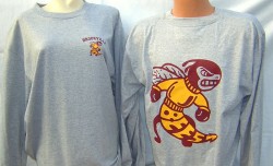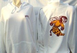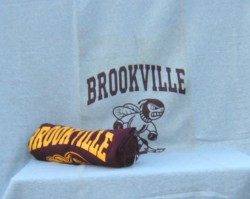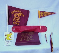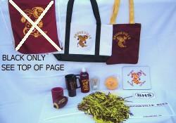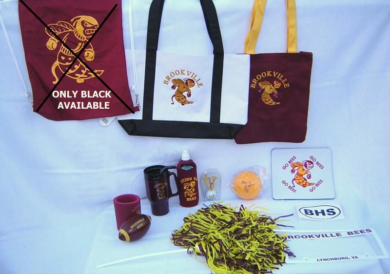 Backpack, large white tote, small maroon tote, football, pom-pom, mouse pad, BHS sticker, coffee mug, coozie, mini-basketball, tennis ball, golf tees, water bottle, license plate frame