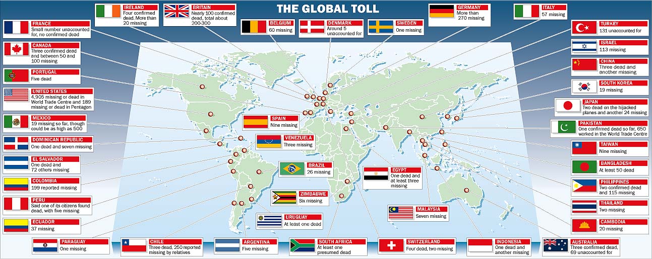 9-11-2001 USA Today Interactive Graphics The Global Toll of 9/11 - Buildings Damaged on 9/11 Origin of Al Qaeda - Al Qaeda Network WTC Facts - WTC Attack Timeline - Taliban Facts Who is Osama bin Laden? - Who are the Taliban? Who are the Northern Alliance? BBC News In-Depth Coverage Home Page Memorials to Victims of September 11, 2001 Tribute To The Victims of September 11th Remembering September 11th - From FoxNews Time Magazine: One Nation, Indivisible The World Will Always Remember The Day The World Will Remember September 11 Digital Archive CNN Memorial To September 11 Victims Flight 93 National Memorial Actual News Archives from September 11, 2001 More Links Related to September 11, 2001 9/11 Memorial Freedom Flag - Description Red Cross: - 1-800-GIVE-LIFE American Red Cross - Twin Towers Orphan Fund Report Terrorist Activity - CNN Emergency Contact Information